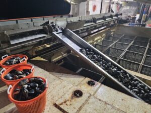 Surfclams going into cages on commercial fishing vessel.