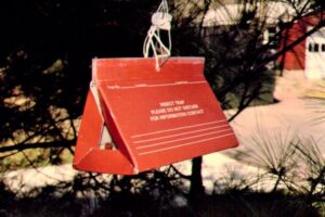 Nantucket Pine Tip Moth delta trap uses the female pheromone to capture adult male moths. The traps are not designed to directly provide controls, but are used to time preventative insecticides. (Photo Credit: Steven K. Rettke, Rutgers Coop. Ext.)