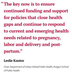 “New Jersey has done an excellent job in legislating and implementing initiatives that, over time, will make a real and meaningful difference in maternal health,” said Leslie M. Kantor, chair of the Department of Urban-Global Public Health at the Rutgers School of Public Health. “The key now is to ensure continued funding and support for policies that close health gaps and continue to respond to current and emerging health needs related to pregnancy, labor and delivery and post-partum.”