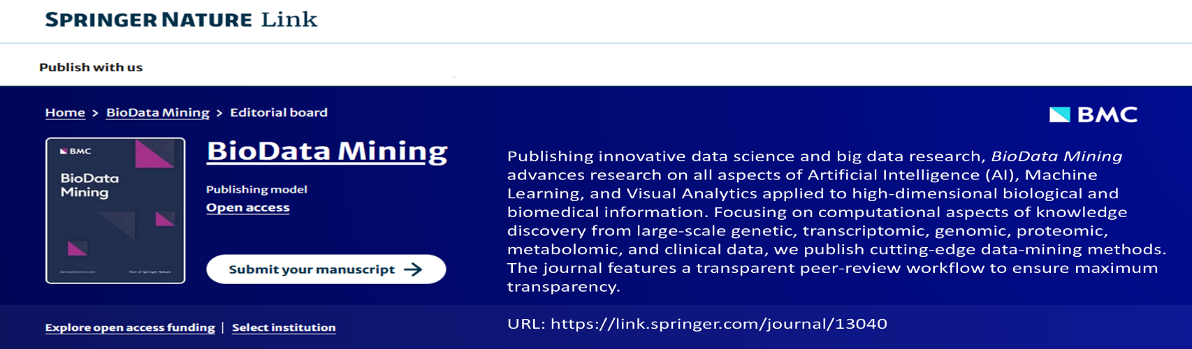 BioData Mining is an excellent and high impact journal edited by Dr. Jason Moore and Dr. Nicholas Tatonetti, and published by the BioMed Central (BMC) and Springer Nature. It publishes innovative data science and big data research, including advancements on all aspects of Artificial Intelligence (AI), Machine Learning (ML), and Visual Analytics applied to high-dimensional biological and biomedical information. Its focus include computational aspects of the knowledge discovery from large-scale genetic, transcriptomic, genomic, proteomic, metabolomic, and clinical data, and cutting-edge data-mining methods.